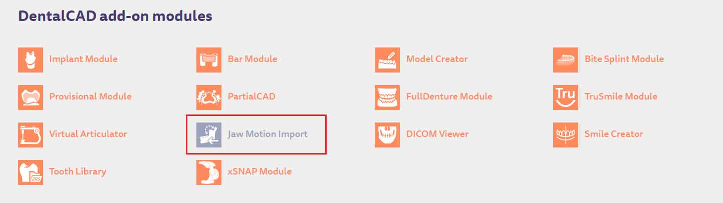 Utilisez le module complémentaire "Jaw motion import" dans votre logiciel dentaire pour pouvoir importer et utiliser les données 4D de MODJAW. Veuillez contacter votre revendeur si votre licence n'est pas équipée de ce module.
