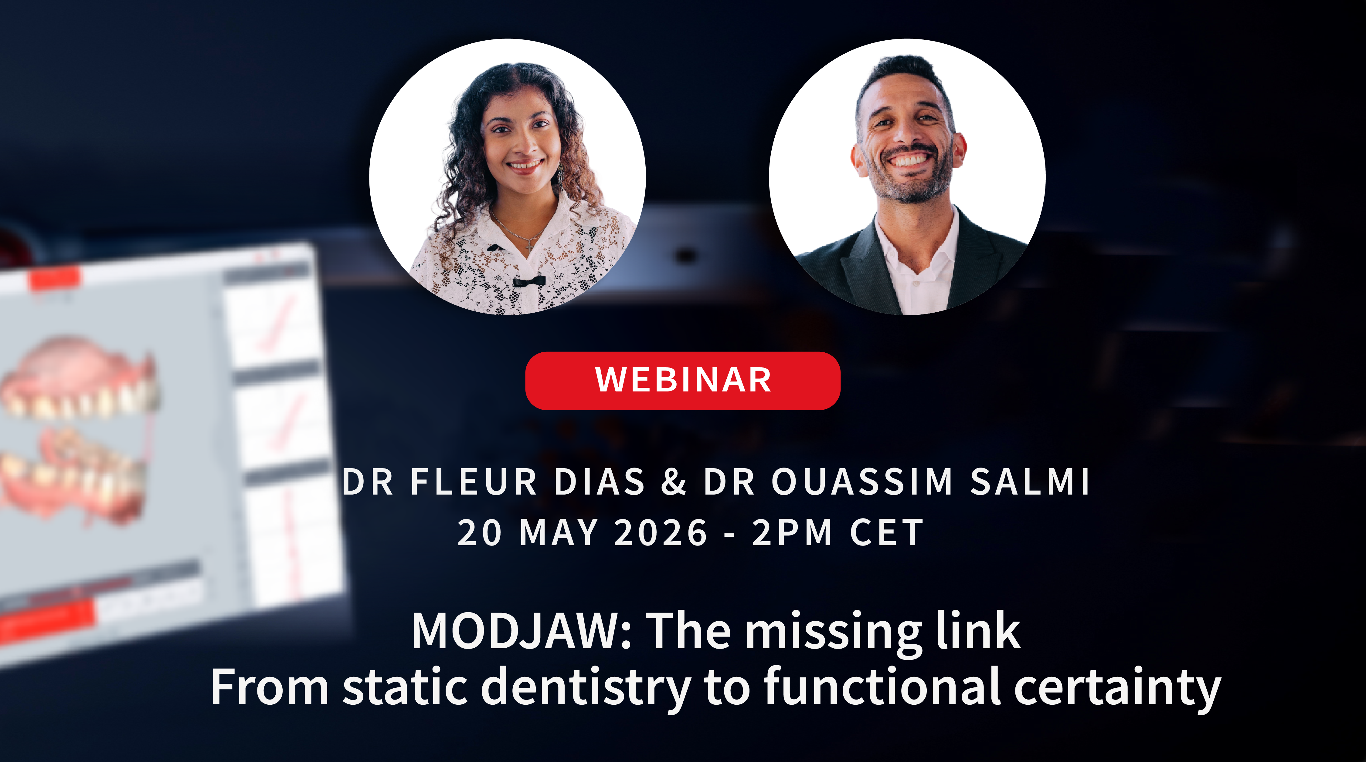 A focused webinar designed to explore what may be missing in today’s digital workflows and why functional data could be the key to greater clinical predictability. With Dr Fleur Dias and Dr Ouassim Salmi, this session invites clinicians to rethink static dentistry through a more dynamic and function-driven lens.